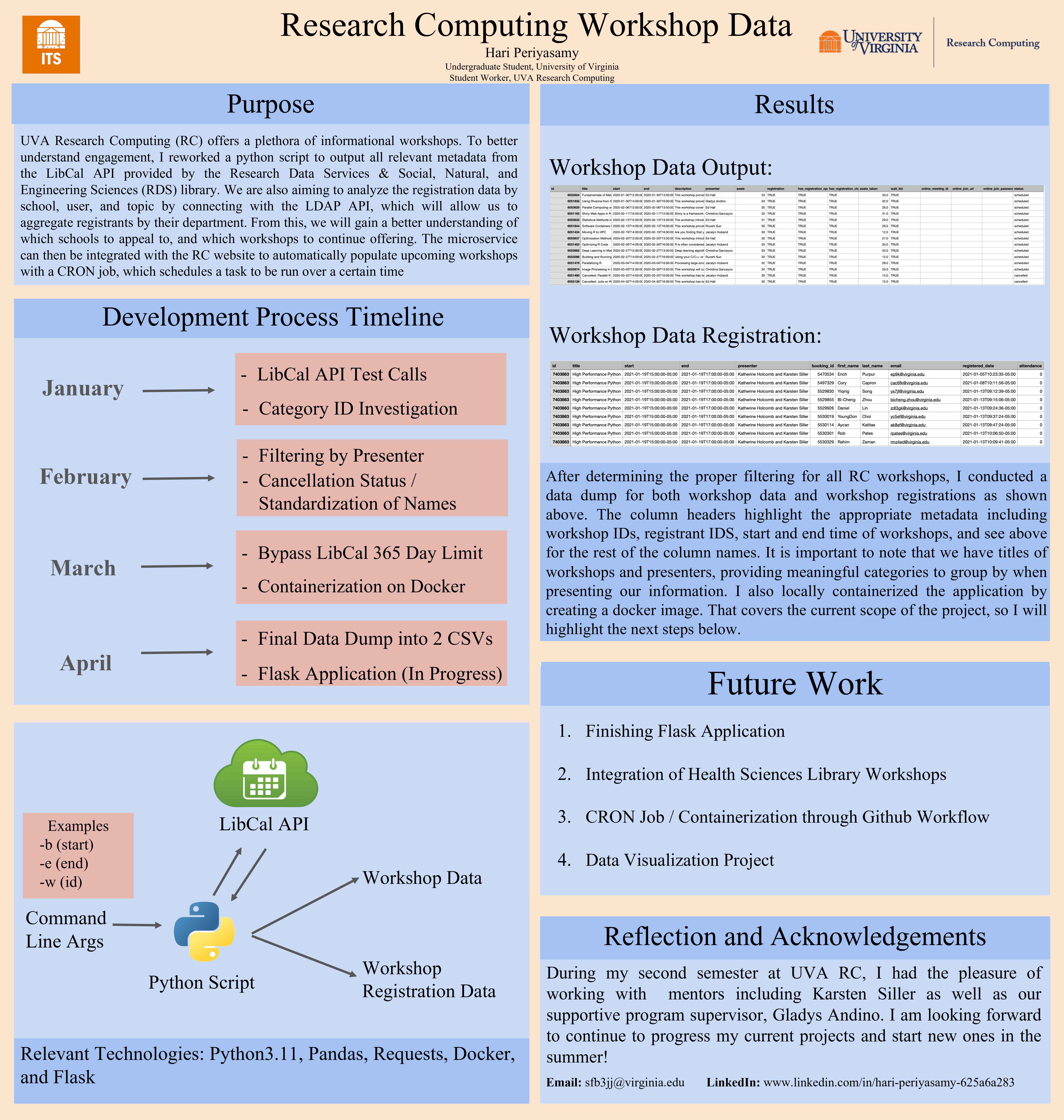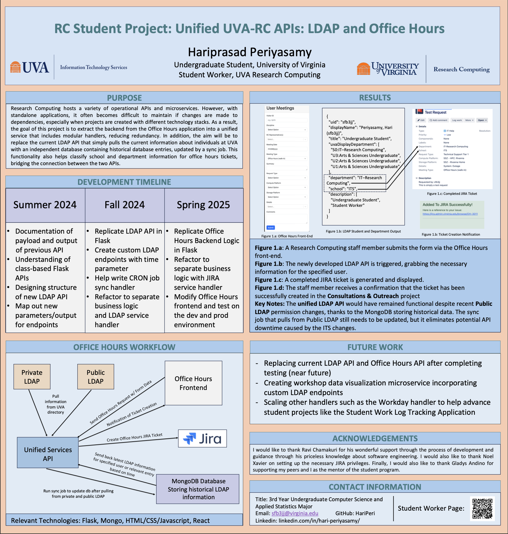 Project Description: Hari contributed to the unified UVA-RC APIs initiative. He helped out in replacing the existing LDAP API and Office Hours application and integrating the now modularized software into a class-based Flask API that houses all of the existing backends. In addition, he upgraded the LDAP API to have the ability to query for time-based entries, a key endpoint necessary for the Workshop Data Visualization Project.